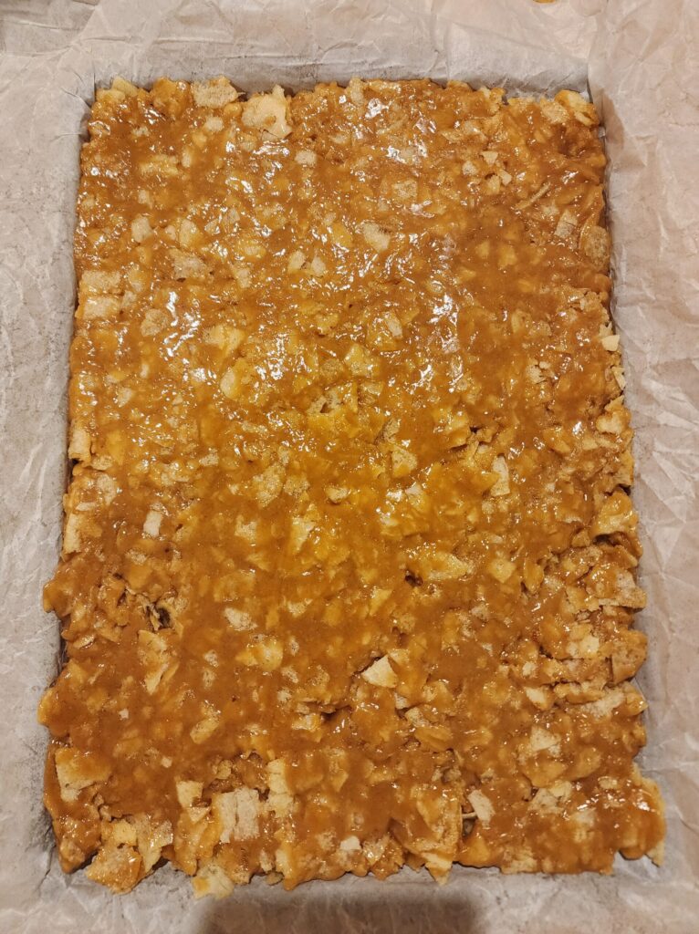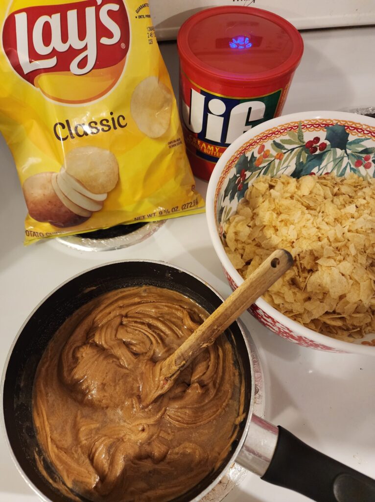 - Pour the hot peanut butter mixture over the crushed potato chips. Stir gently until the chips are evenly coated.
