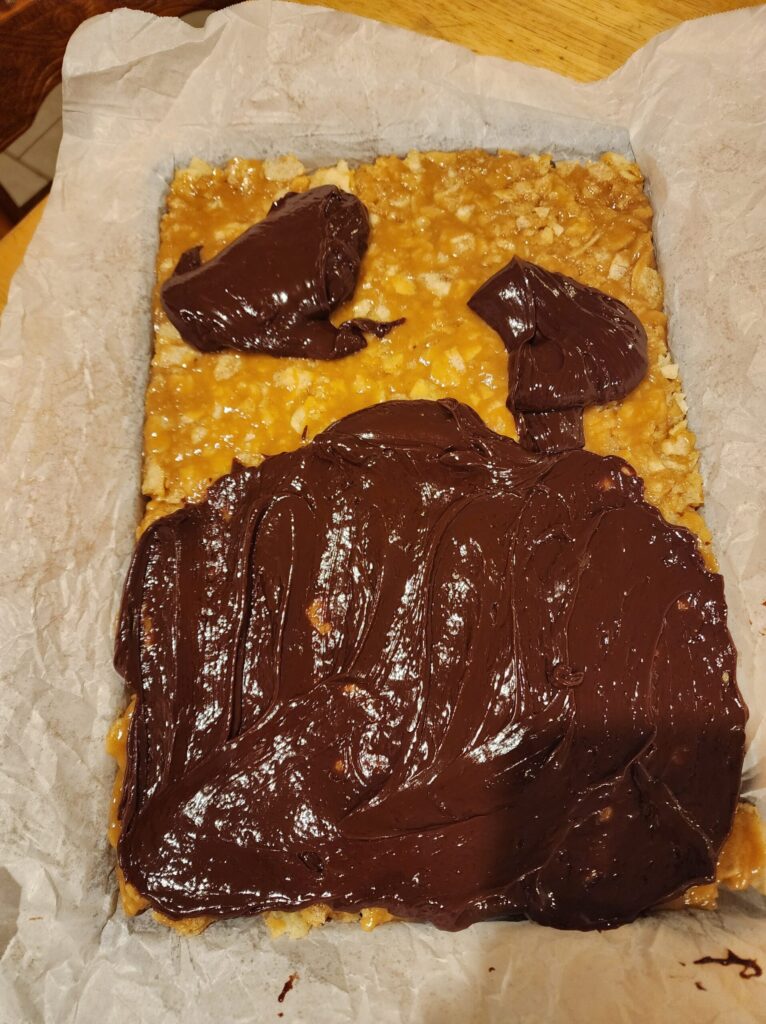 - Spread the mixture evenly onto the prepared pan, pressing lightly to level the surface.