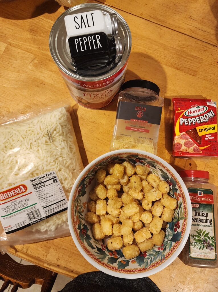 - 1. Preheat oven to 425°F (220°C).2. Thaw tater tots, then crush them in a large bowl.3. Add mozzarella cheese, eggs, Italian seasoning, salt, and pepper. Mix well.4. Press mixture evenly onto a parchment-lined baking sheet (about ½ inch thick. Press it down with your hands as much as you can).5. Bake for 20 minutes, until edges are golden and crisp.6. Remove from oven and add pizza sauce, cheese, and toppings.7. Return to oven and bake 10 more minutes, or until melted and bubbly.8. Slice and serve!